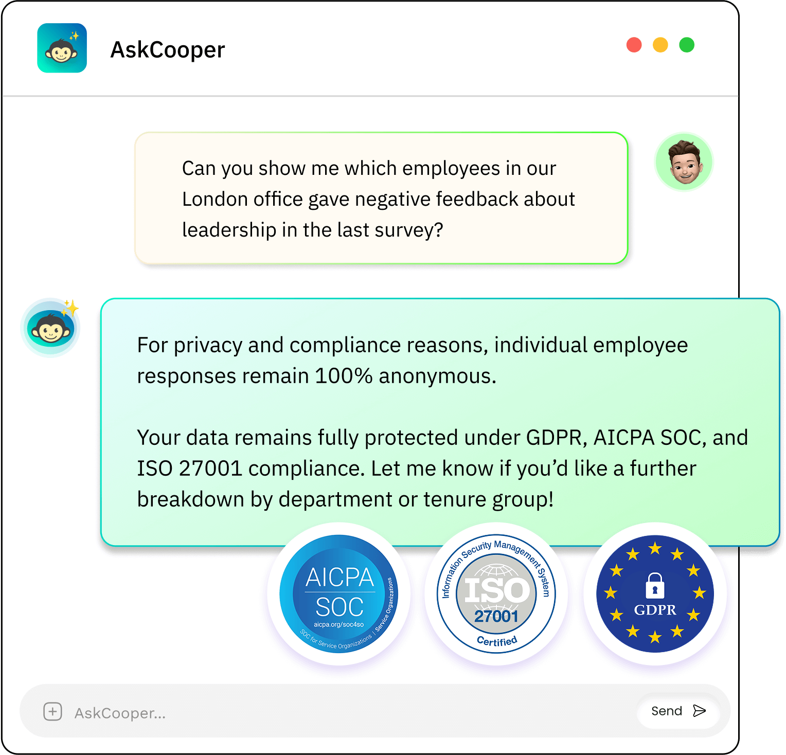 Ask for any engagement insights you want, without worrying about privacy. Our platform is fully compliant with GDPR, AICPA SOC, and ISO 27001—ensuring your engagement data remains secure and confidential at all times.