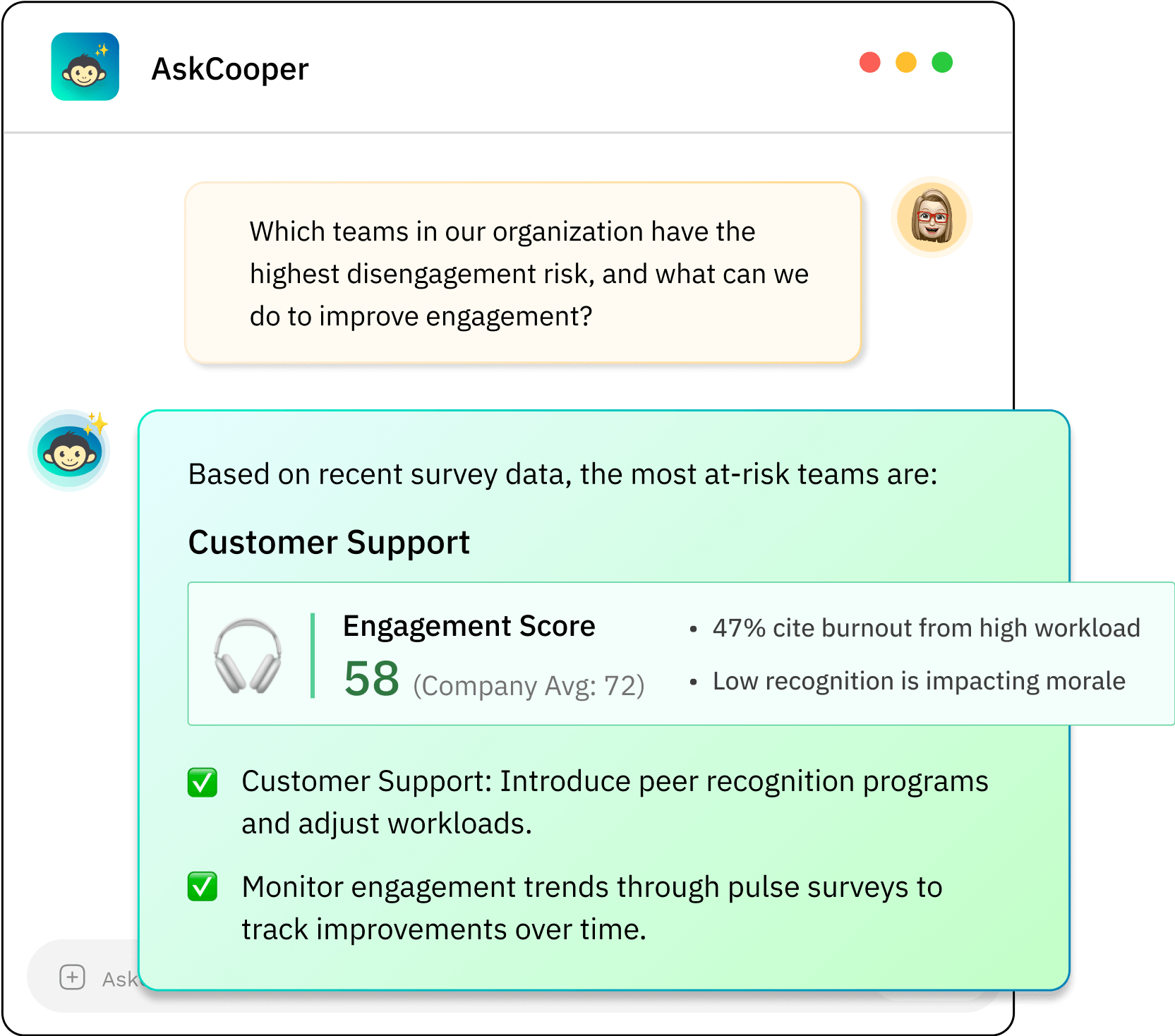 AskCooper translates complex HR data into clear, actionable insights—giving you instant answers to engagement challenges without the need for manual analysis.